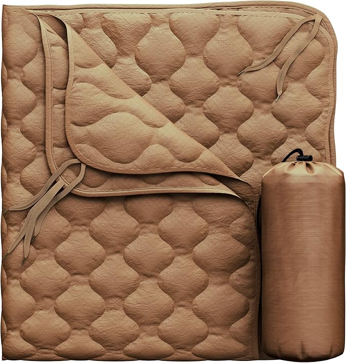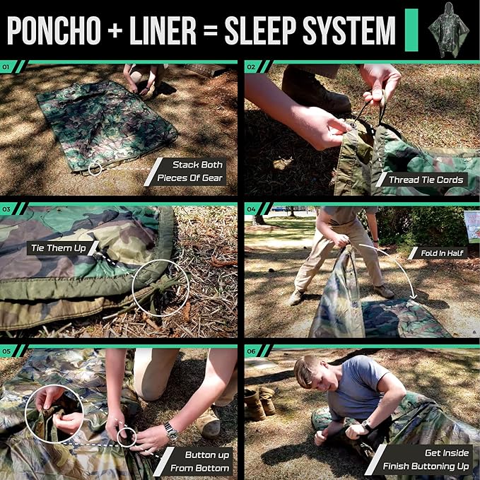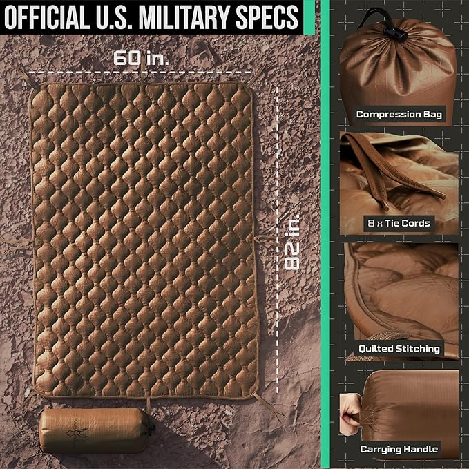 - CRAFTED TO WITHSTAND THE TEST OF TIME: Durable & lightweight woven nylon fabric with quick-dry polyester batting. Reinforced with wave-patterned insulating camping quilt to keep you dry and warm, preventing sweat condensation. Features 8 pairs of tie cords around the edge with reinforced stitching for full compatibility with the poncho. OFFICIAL SIZE: This Poncho Liner is 62x82in and weighs 1.75 lbs including the military style compression sack to maximize your space capacity.
