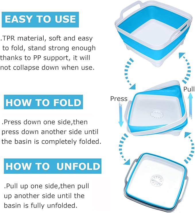 - 【Premium Quality】: The collapsible wash basin is made from New PP + TPR material, BPA free and dishwasher safe. It’s sturdy and durable will not crack or split. Come with a 9L large capacity to provide plenty of room for accessories.