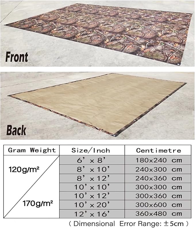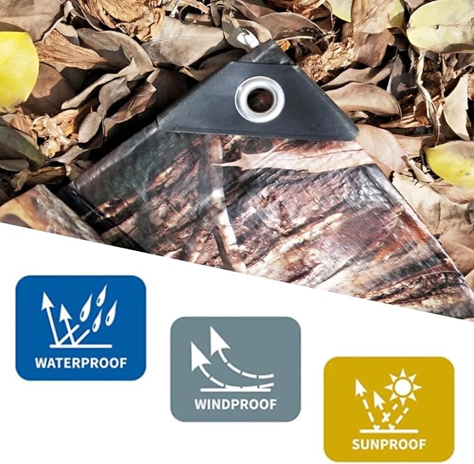 - High Qualtiy Fabric: Tongcamo tarp is made of high-density, tightly woven, made-to-last polyethylene fibers, UV protection against harmful sunrays and fading, waterproof, sunproof and windproof, can be applied to rain, shine, snow or wind all seasons. It has the strength, durability, woven tightly together and the plastic is laminated. The Tree Camo Tarpaulin has a 10 mil thickness, 5 oz. per square yard, and a 12 x 14 weave count.