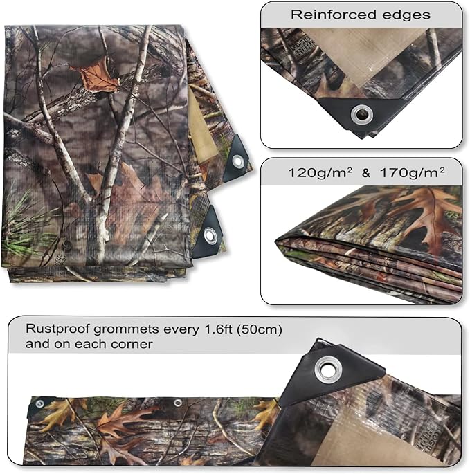 - High Qualtiy Fabric: Tongcamo tarp is made of high-density, tightly woven, made-to-last polyethylene fibers, UV protection against harmful sunrays and fading, waterproof, sunproof and windproof, can be applied to rain, shine, snow or wind all seasons. It has the strength, durability, woven tightly together and the plastic is laminated. The Tree Camo Tarpaulin has a 10 mil thickness, 5 oz. per square yard, and a 12 x 14 weave count.