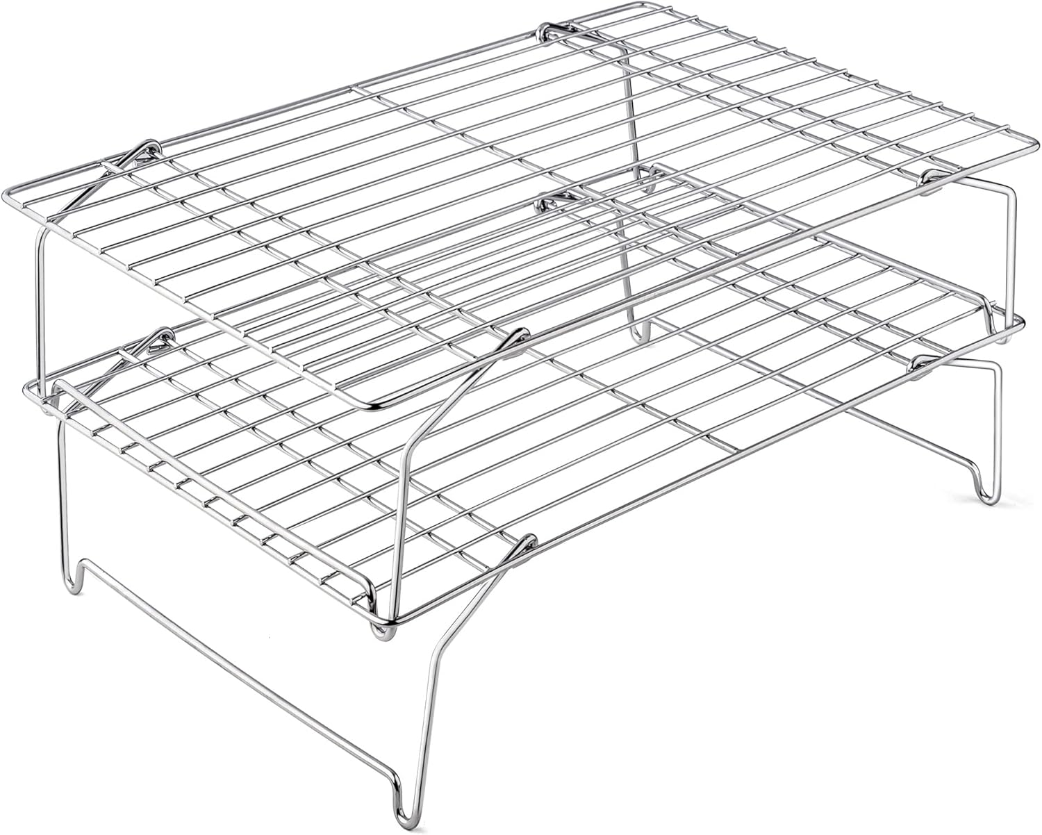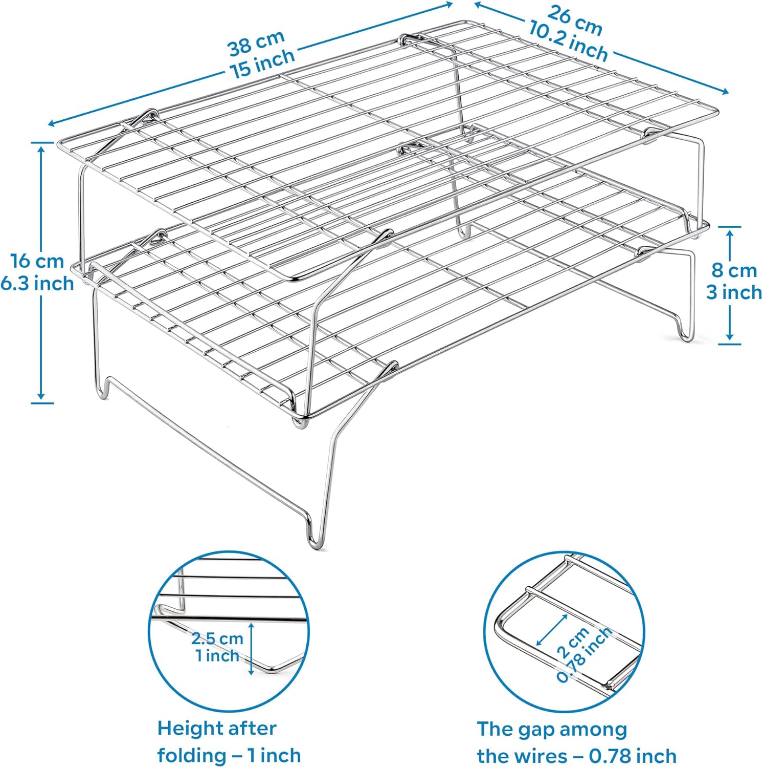 - Saving counter space, the two-tiered wire rack set contains 2 individual cooling racks, the flexible feet of each oven rack can be opened and stack on top of each other for cooling dozens of cookies or cup cakes all at once without taking up lots of counter space, the feet with the arc design help the cooling rack stand stably without sliding, collapsible feet for easily folding to 1 inch height, saving space and easy storage in your cabinet or drawer
