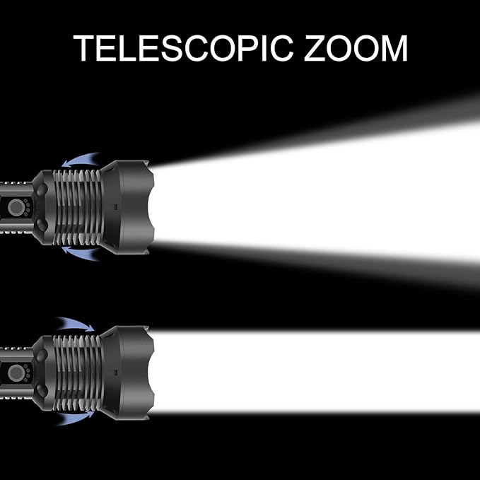 - 【Zoomable flashlight】This brightest flashlight can be stretched the head to adjust the focus to zoom in and zoom out. The floodlight for area illumination and the spotlight for long-range observation.