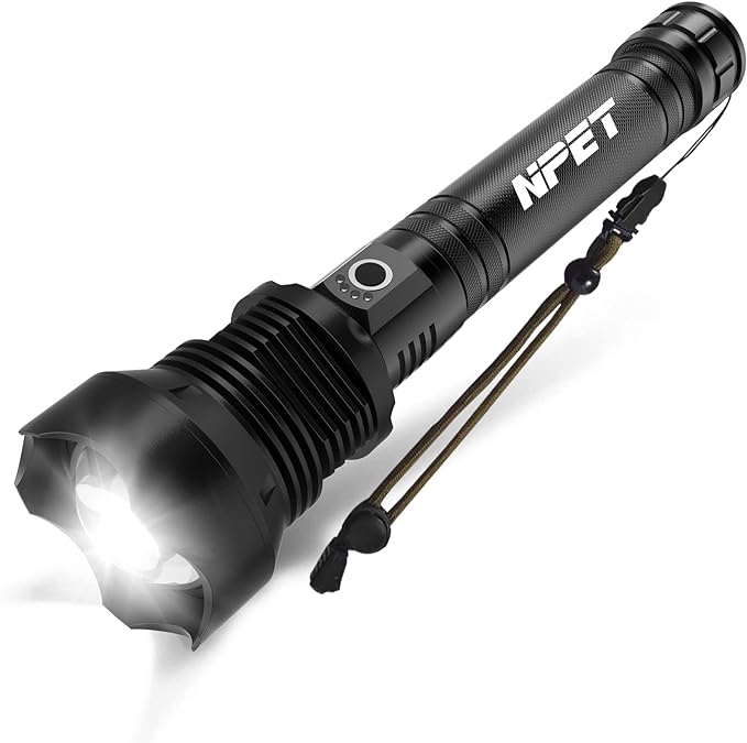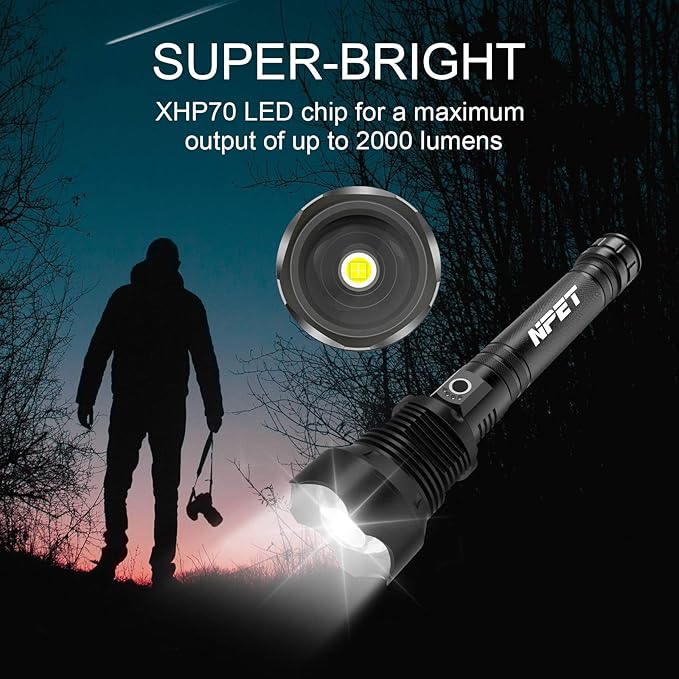 NPET XHP70 LED Flashlight USB Rechargeable Tactical Flashlight, Super Bright 2000 Lumens Zoomable Flashlight Camping, Hiking, Home, Outdoor and Emergency, with Waterproof and Shock Resistant