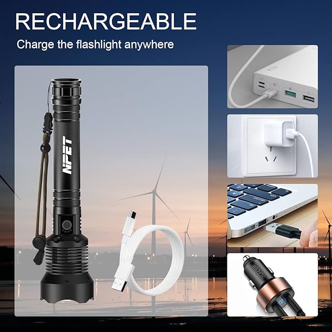 - 【Rechargeable & Power Display】With a built-in USB charge slot, it is convenience to charge the flashlight by power bank, computer, car charger, etc.