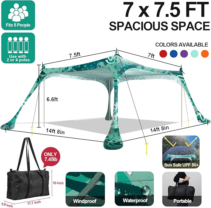 - UV Protection and Waterproof:Beach tent pop up sun shelter 7x7.5ft is made of high stretch Lycra fabric which is waterproof, windproof, sun protection, lightweight so that you will never worry about any stretches and tears. Our beach shade canopy offering UPF 50+ sun coverage to keep you and your family from the harmful UV rays and reduce sun burn or glare making it ideal for kids or adults laying out. This large sun tents for long-term outdoor use