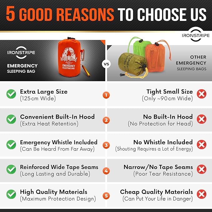 - AT IRONSTRIPE, WE’RE DEDICATED to designing reliable, quality-made survival gear YOU CAN TRUST for your SAFETY and WELL-BEING. Made with sturdy materials and heavy-duty construction, our emergency bivvy bag is the dependable choice for ACTIVE INDIVIDUALS and FAMILIES. OUR CUSTOMERS ARE OUR FIRST PRIORITY. If for any reason you aren’t satisfied with your emergency outdoor thermal sleeping bag, we’re standing by to help.