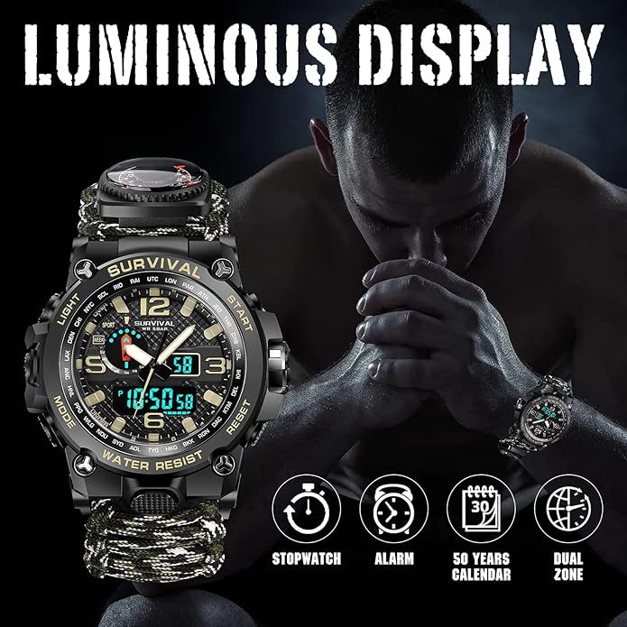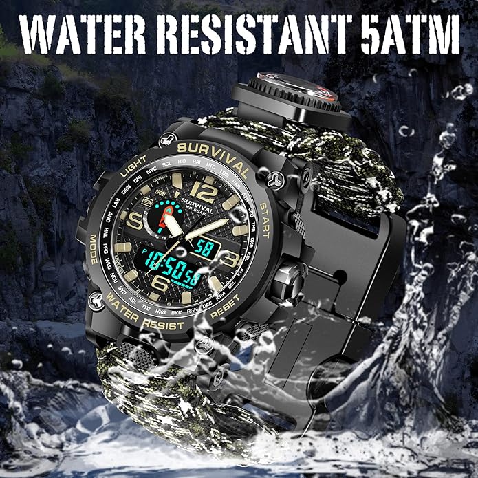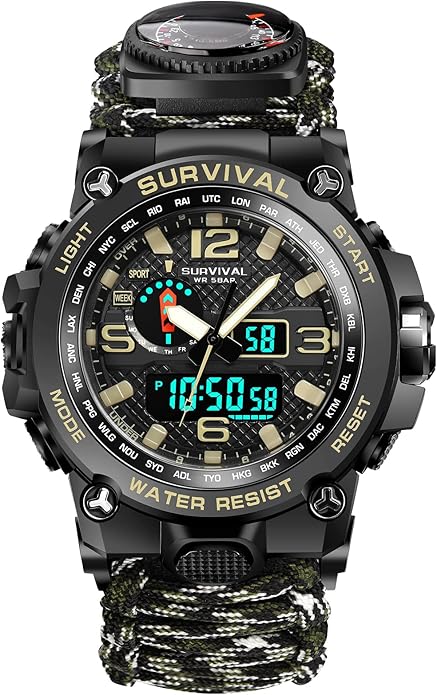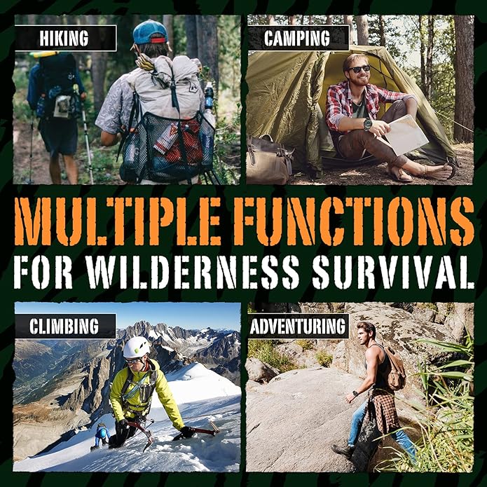 - 23-IN-1 Multi-Functional Survival Gear: This military watch contains all the tools you need for outdoor use, such as compass, whistle, igniter, SOS/flash, tools-fire starter, card pin and other survival gear. You don’t need to carry all survival tools in your backpack. It is suitable for various outdoor activities, such as traveling, camping, mountain climbing, hunting.