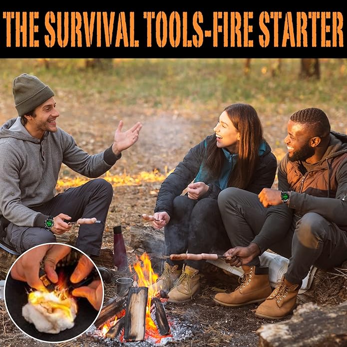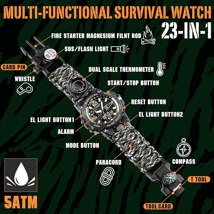 23-in-1 Military Tactical Watch for Men, Multifunctional Outdoors Waterproof Survival Watches with Compass Whistle Fire Starter and Thermometer, Paracord Watch Bracelets with Outdoor Army Gear…