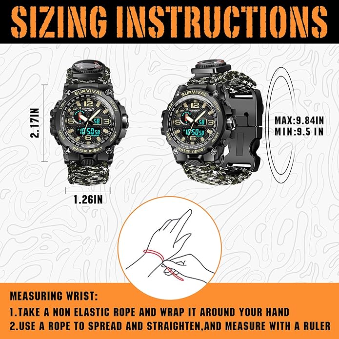 - 2-in-1 Survival Strap: The difference between our strap and ordinary strap is that our strap has a Velcro inside, which can be adjusted to fit the best length of your wrist. The length of the watch is adjustable from 10.24 to 11.02 inches. The rope strap can be disassembled to be a paracord that can bear up to 250pounds.