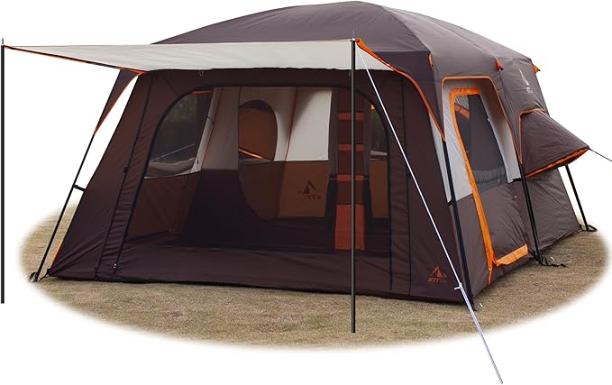 KTT Large Family Cabin Tent 10-12 Person,14.1X10X6.58ft,2 Rooms,3 Storage Pockets,2 Bay-Windows 3 Doors and 3 Windows with Mesh,Straight Wall,Waterproof,Double Layer,Big Tent for Outdoor,Camping