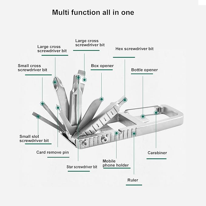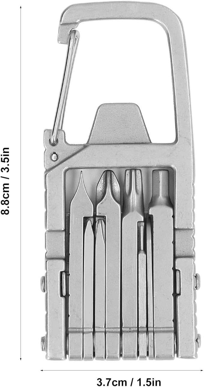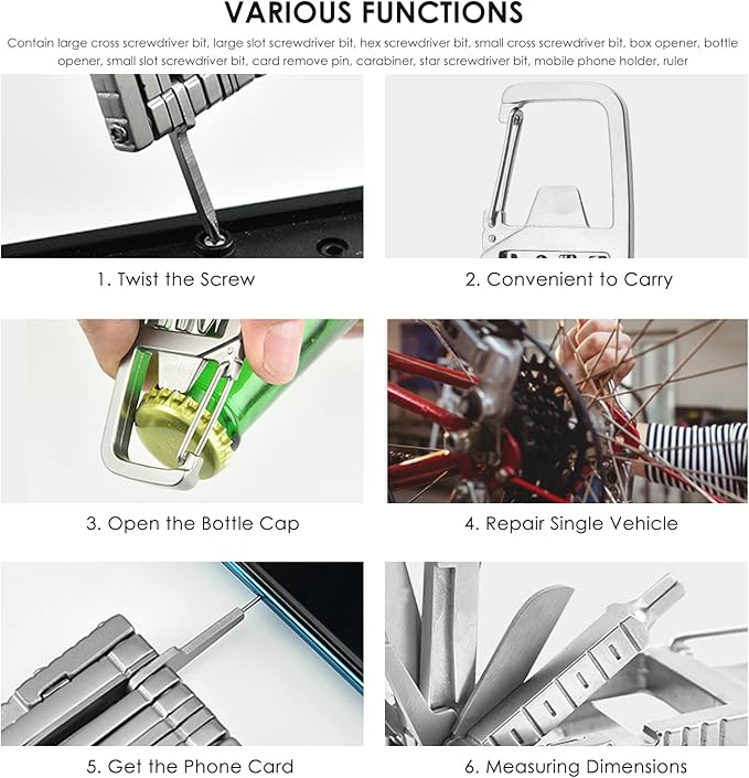 - INCLUDED FUNCTIONS: Contain large cross screwdriver bit, large slot screwdriver bit, hex screwdriver bit, small cross screwdriver bit, box opener, bottle opener, small slot screwdriver bit, card remove pin, carabiner, star screwdriver bit, mobile phone holder, ruler