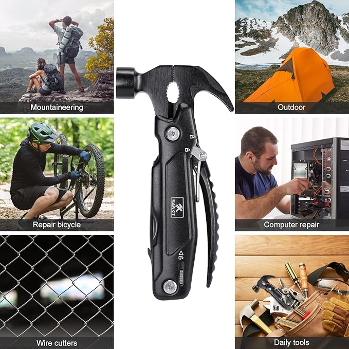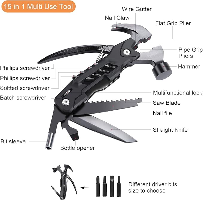 - 【All in One Tools 】15 in 1 Hammer multitool includes Mini Hammer Head,Flat Grip Pliers,Pipe Grip Pliers,Nail Claw,Wire Cutter,Straight Knif,Saw Blade,frish hook remover,bottle opener,etc.The tools are made of high-quality stainless steel,wear-resistant and anti-rust.One machine with multiple functions can meet your daily needs and become a must-have fashion gadget for men.t is an ideal choice for camping, fishing, hiking, hunting, backpacking, and also an escape emergency.