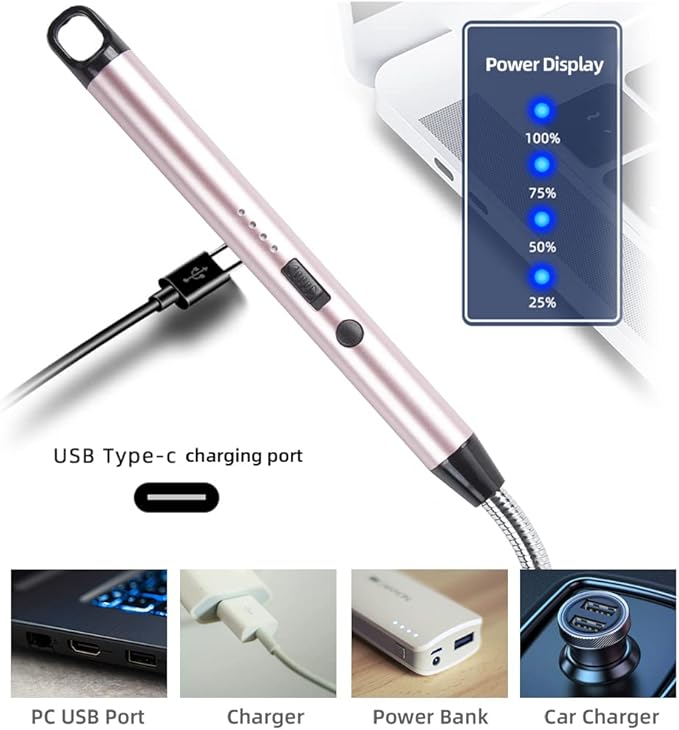 - 【USB Charging】:The arc lighter is equipped with USB charging,type-c charging interface,arc lighter can be charged directly from the power source or using a power bank,computer,etc,candle lighter can be used more than 500 times in per charge.The electric candle lighter with LED power indicator light,it can remind you to charge in time.