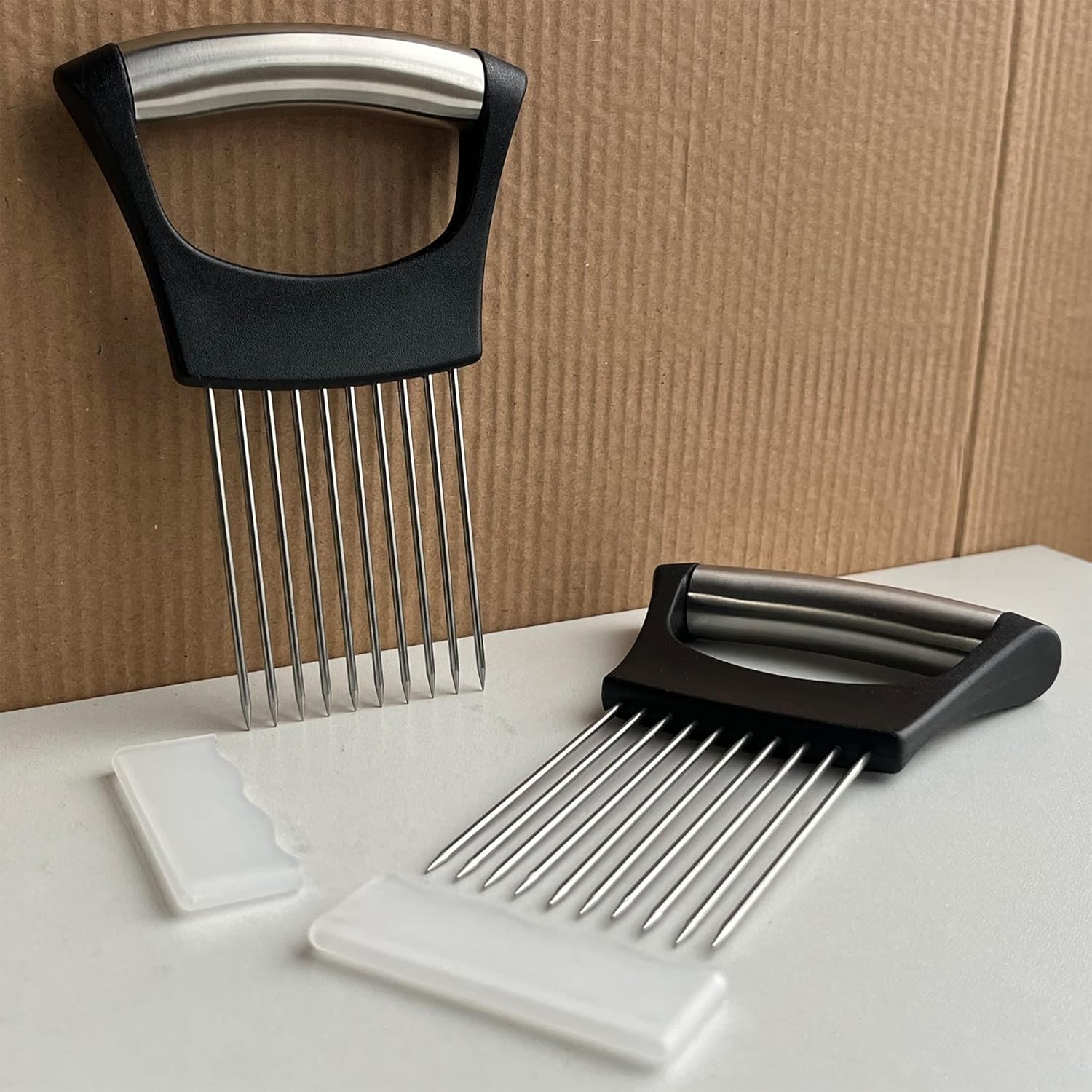 2 Pcs Onion Slicer holder, Premium Vegetable Slicing Tool for Potato and Tomato, Food Cutter Assistant Tool for Slicing Fruit Lemon and Meat, Stainless Steel Kitchen Tool (Black)