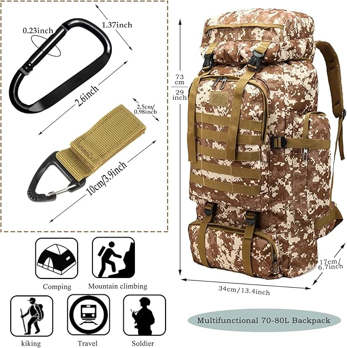 - 70L Large-Capacity: Military rucksuck is made of 600D Oxford fabric and waterproof materials, making it more robust, durable, tear-resistant, and scratch-resistant compared to other hiking backpacks. With a massive 70L capacity, this packable backpack is suitable for your one-week journey, accommodating items such as sleeping bags, clothing, shoes, notebooks, and more.