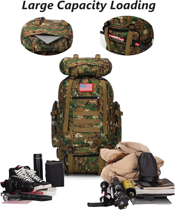 - 【Large Capacity Loading】: 100L large capacity camping mountaineering backpack main bag can hold clothes, quilts, tents, sleeping bags and travel items, and can accommodate 2-3 people travel gear. The molle system can be used to bundle and carry items such as moisture pads, trekking poles, sleeping pads, picnic mats, camera stands and more.