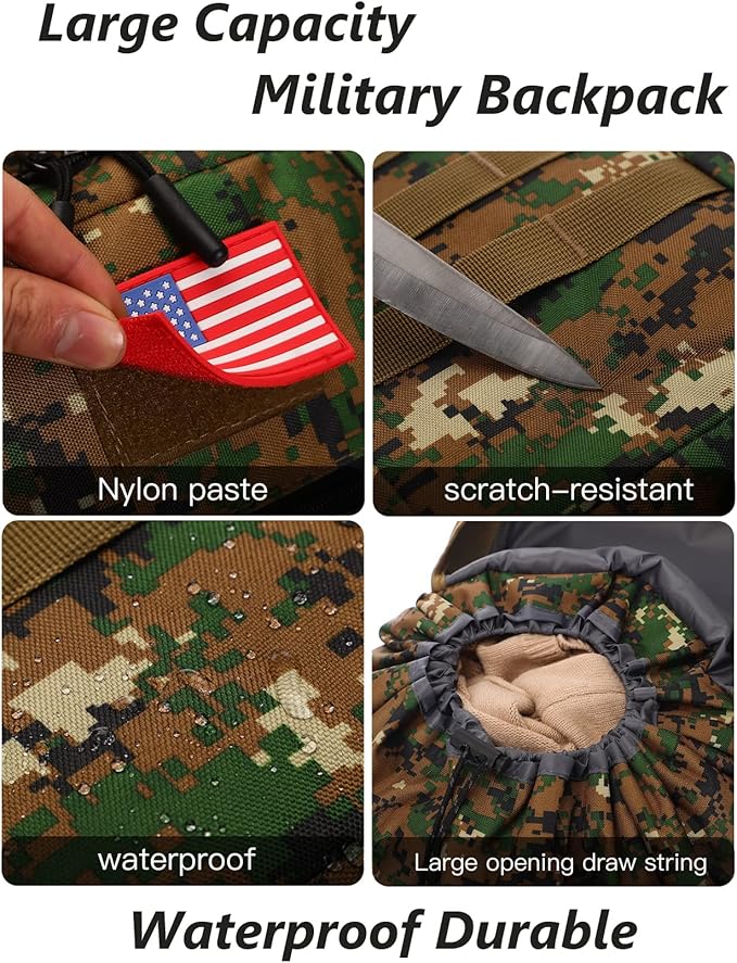 - 【Waterproof Fabric】: The tactical military backpack is made of 600D Oxford cloth and waterproof material. Military backpack thickened density tear-resistant Oxford fabric is waterproof and wear-resistant, tough and odor-free. More durable and scratch resistant than traditional hiking backpacks.