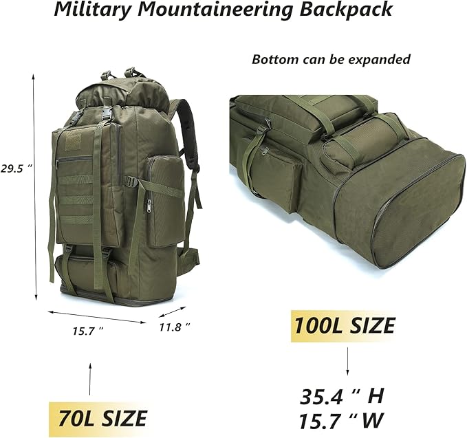- 【Large Capacity Loading】: 100L large capacity camping mountaineering backpack main bag can hold clothes, quilts, tents, sleeping bags and travel items, and can accommodate 2-3 people travel gear. The molle system can be used to bundle and carry items such as moisture pads, trekking poles, sleeping pads, picnic mats, camera stands and more.