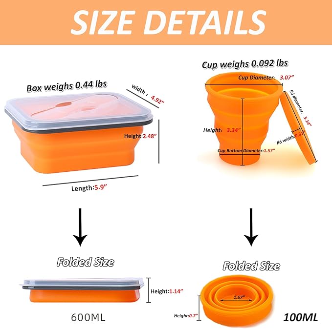 - Lightweight and Compact camp mess kit:The collapsible bowls with lids for camping leak proof weighs 7.04 oz. Only 1.14" in thickness when collapsed. The collapsible cup with lid weighs 1.47 oz.Only 0.7" in thickness when collapsed.