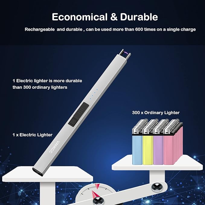 - 【LARGE CAPACITY & BATTERY NOTIFICATION】 Equipped with real 220 mAh large capacity big battery, the USB lighter can provides over 600 uses on a full charge, it is definitely a high-efficiency lighter. This is the upgraded arc lighter which can display real-time battery volume. When 4 LED lights on the barrel turn on, it is fully charged. The power display will always remind you to recharge in time.