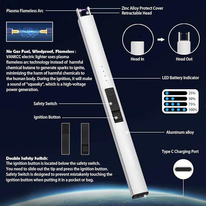 - 【Windproof, Flameless & Butane Free】The handheld lighter uses plasma flameless arc technology instead of harmful chemical butane, which is healthier and safer, butane free, oil-free, smoke-free, odorless. The wind and splash proof design will protect the lighter from being blown out by strong wind or wet weather, ensures easily use in any weather conditions. Perfect for candles, stoves, BBQ grills, camping, hiking, fireworks, household use and outdoor activities.