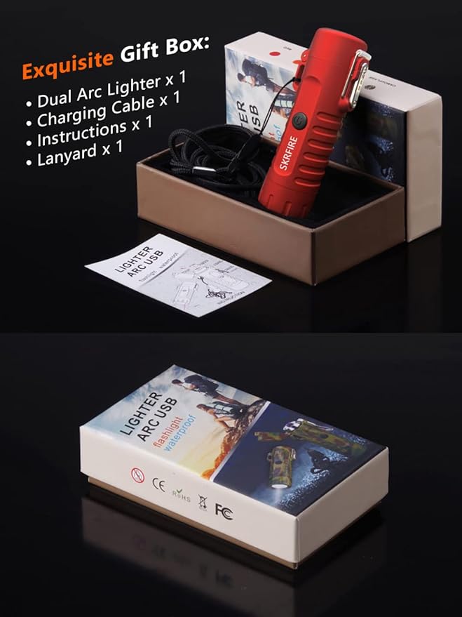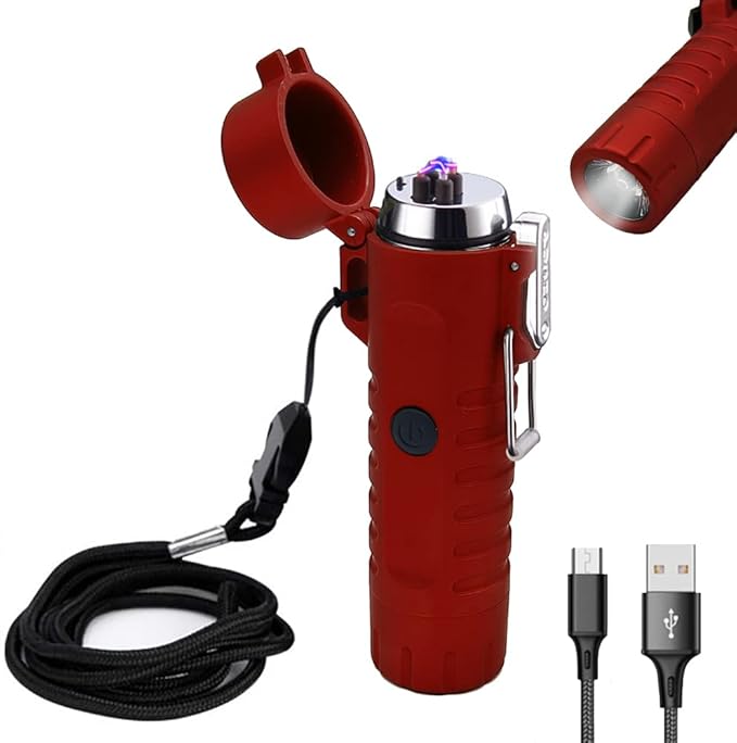 YOZWOO Electric Lighter for Camping, Windproof Dual Arc Lighter with LED Flashlight, USB Rechargeable Lighter for Outdoor Hiking, Waterproof Plasma Lighter for Survival Kits (Red)