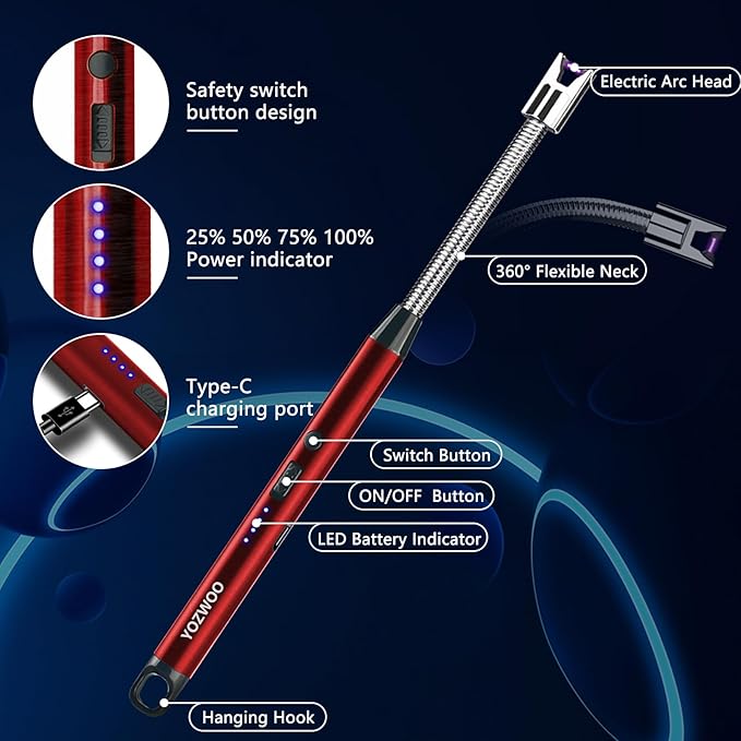 - 📢【360° Ultra Long Rotatable Neck】 This safety electric lighter owns a 4 inch long flexible neck for wide use. It can be bent at any angle to fit your needs for any occasions. Such as deep bottle aromatherapy candles, solid alcohol, incense, gas stoves, fireplaces, campfire, barbecue, fireworks, or other different use scenarios.Compared with ordinary lighters and matches, it is more convenient, safer and faster ignite stoves, fireworks, etc., protect you and Your family from burned.