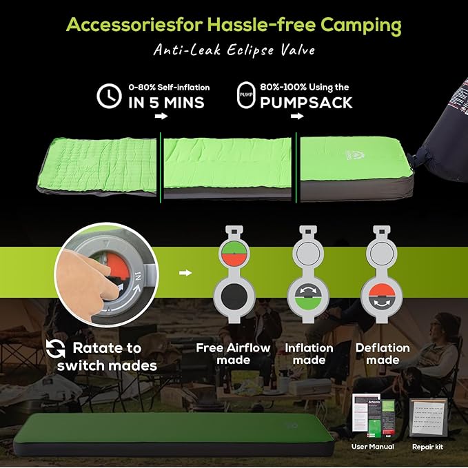 - Accessories For Hassle-free Camping: Artemis camp mattress features a self-inflating lungs-free mechanism that lets you reach from 0 to 80% inflation in 5 minutes effortlessly. Use the pump sack to get to 100% the pump-sack doubles as a storage Pouch. Plus, a repair kit with instructions is included for any emergency situations. Simplify your camping setup and storage with Artemis.