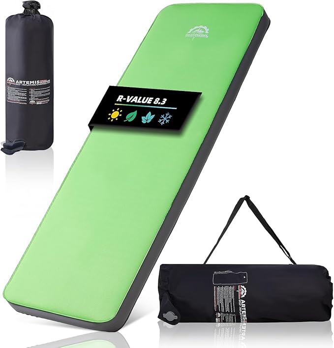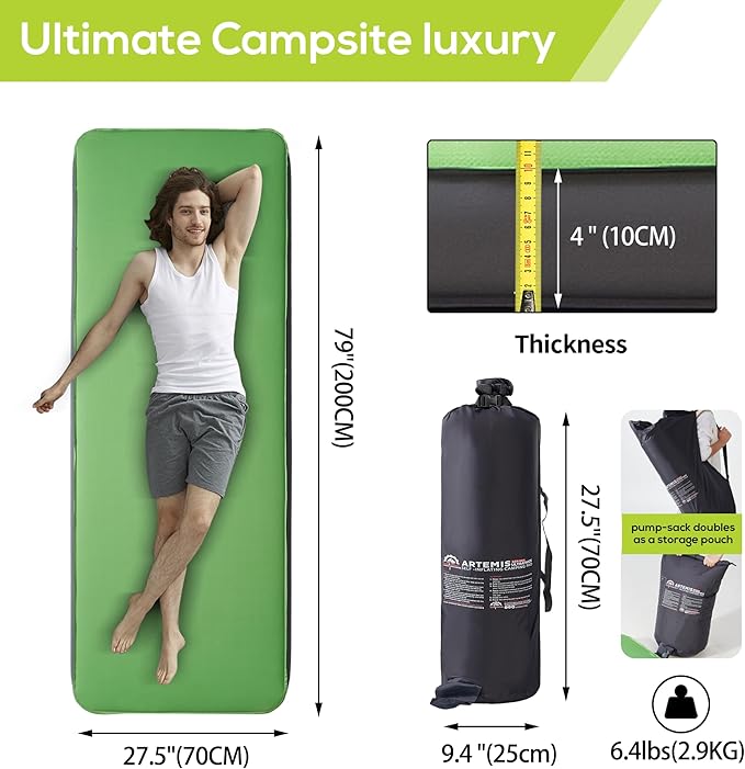 - The Ultimate Campsite Luxury: Artemis 3D self-inflating sleeping pad Air-Foam hybrid offers the comfort of an expensive home mattress, 4" thick with an R-Value of 8.3 for warmth in cold nights, [79"×27.2”] size, and packs [27.5"×9.4"] 6.4 lbs. Elevate your camping experience with ultimate luxury