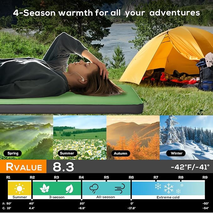 - Unbeatable 4-Season Warmth for all your adventures: Our 8.3 R-Value camping pad offers unbeatable comfort and warmth for year-round outdoor adventures.Ideal for car camping, luxury camps, hunting, or even use it when you have a sleepover guest because it offers a home-like sleeping experience in the great outdoors,-Stay cozy and comfortable in any season, anywhere