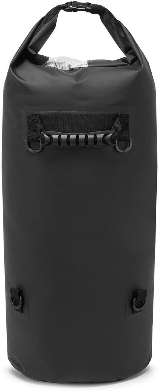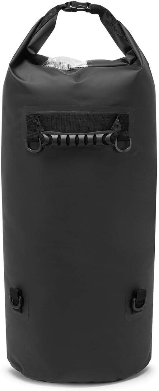 - The roll-down closure with side release fastenings creates a watertight seal to keep your valuables safe dry and protected. The bags flat base improves stability meaning it can be stacked in tight upright spaces whilst the multiple external d-ring attachment points can be used for securing.