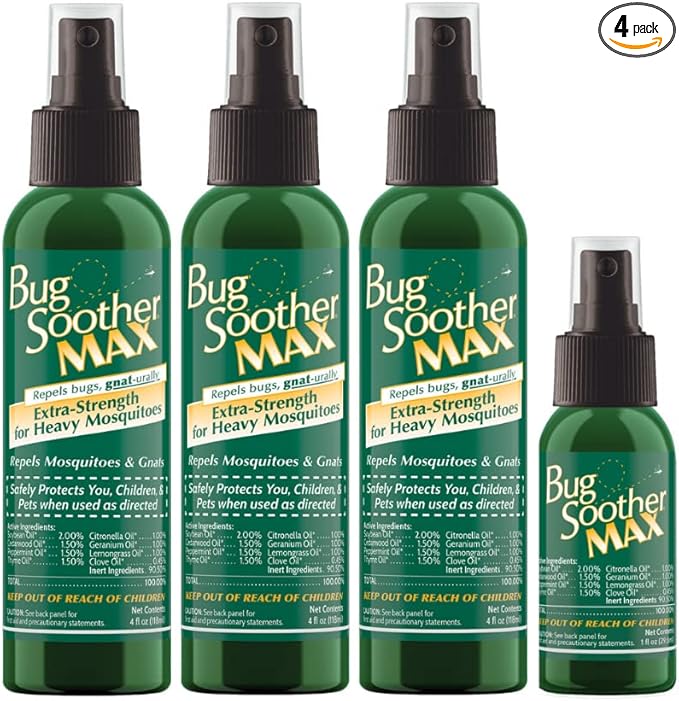 Bug Soother MAX - Extra Strength Natural Gnat, Tick, and Mosquito Repellent, 3 Pack 4 fl oz w/Free 1 oz. Bug Spray Deterrent - DEET Free - Safe for Adults & Environment - Made in USA