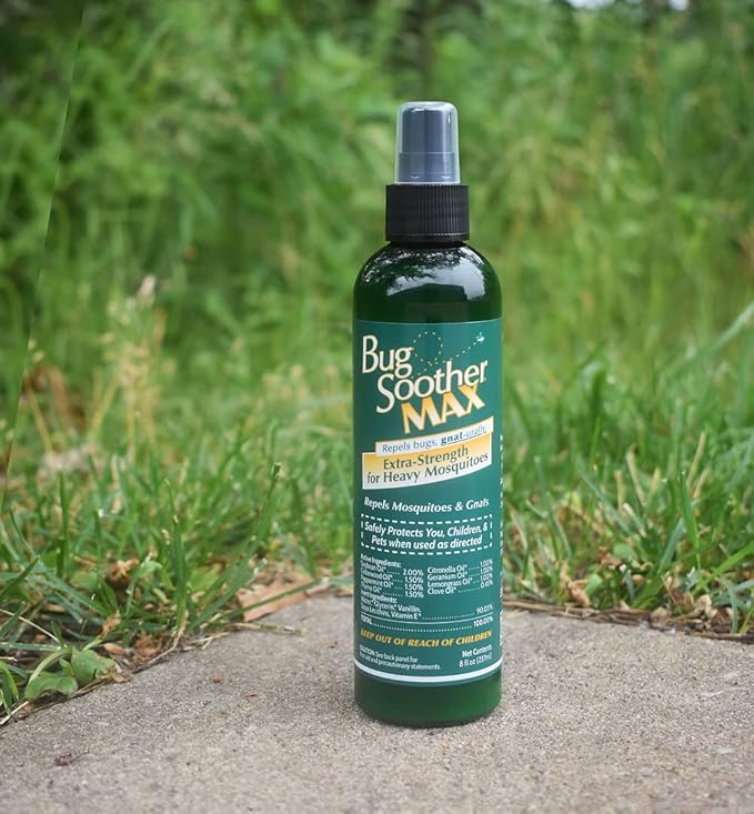 - PREMIUM INGREDIENTS: Bug Soother Max is a natural insect repellent with an herbaceous aroma utilizing woody & floral essential oils. It's non-toxic ingredients include soybean oil, essential oils, purified water, glycerin, vanillin, lecithin and vitamin E - a formula that works great but bugs hate!