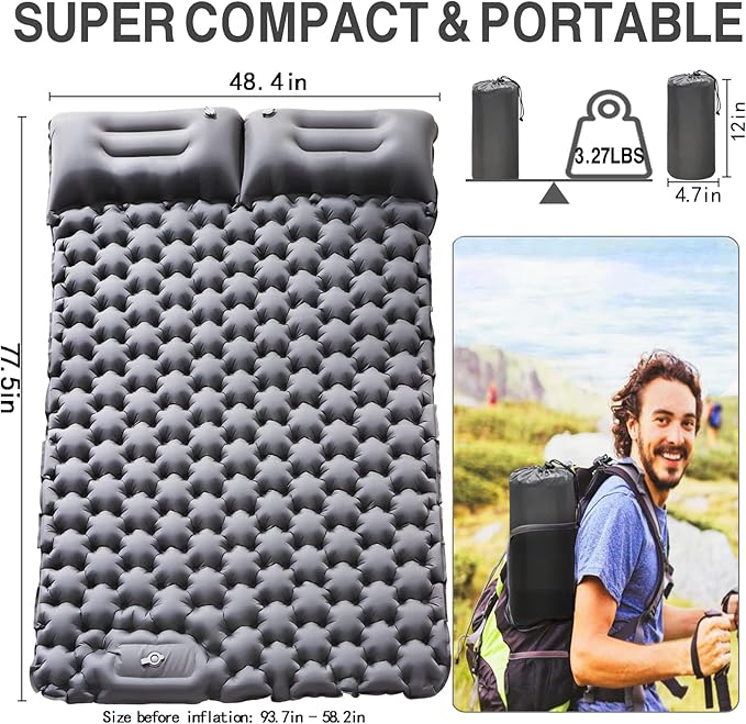 - 【Polka Dot Air Hole Sleeping Pad】Camping sleeping pad is designed with unique polka dot air holes, made according to the human body mapping technology, ergonomic, able to support all the pressure points, so that you feel comfortable to lie down all night, and you definitely deserve a good night's sleep on a long trip.