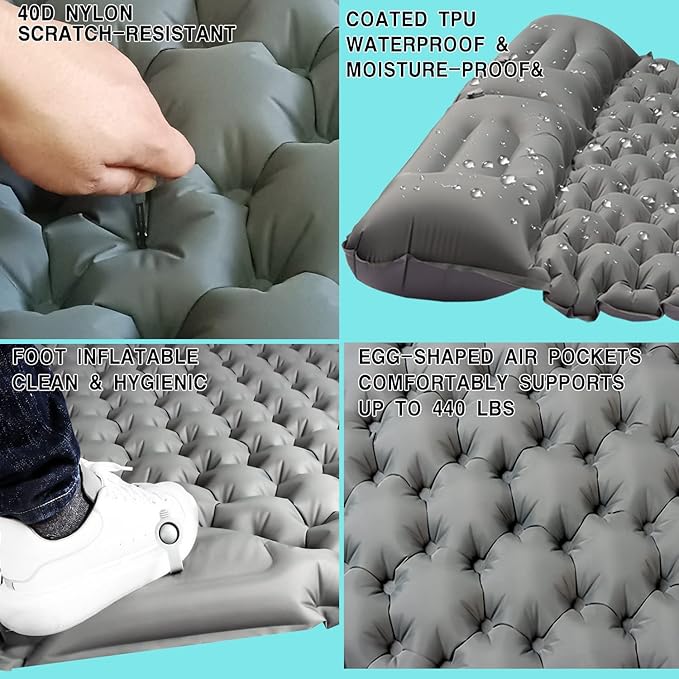 - 【Durable Material Different from Market】The back of the air mattress is made of 50D nylon polyester fiber + multi-layer TPU material, it won't tear even if you use a thick tree branch. The front side of the camping mattress is made of strong 20D nylon material + multi-layer waterproof and durable TPU material, which is strong, soft, noiseless and waterproof, even in the rain, you just need to wipe it with a towel. It can be used for many purposes, such as outdoor mat, camping mat, tent mat and so on.