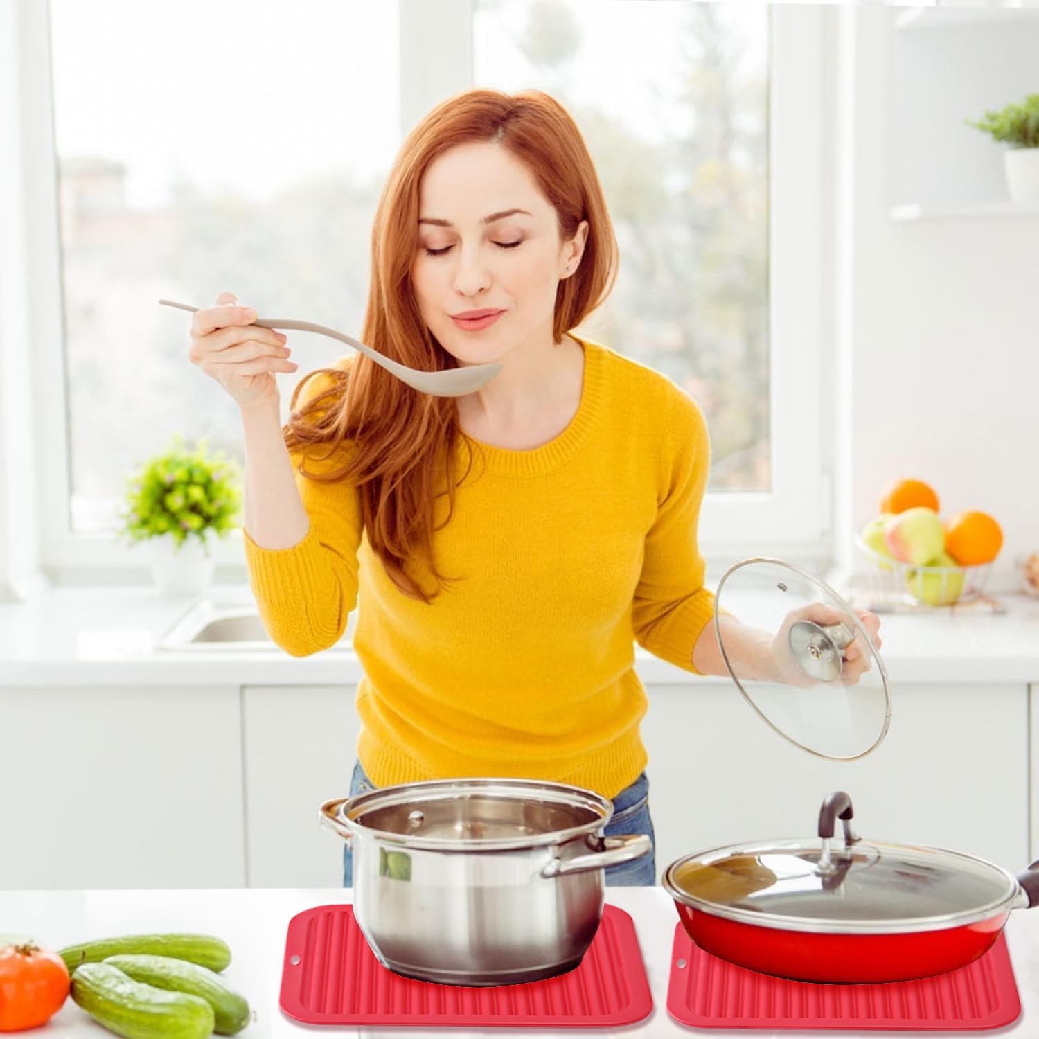 - đăVERSATILE SILICONE TRIVETSăThe 2 pack silicone trivet mats are good kitchen accessories for anything that needs heat protection or grip; use them as a silicone hot pad for hot pot, red hot pot holder, red silicone mat for air fryer, silicone placemat, pot mat, coffee maker mat for countertops, dish drying mat, jar opener, red spoon rest, and so on.