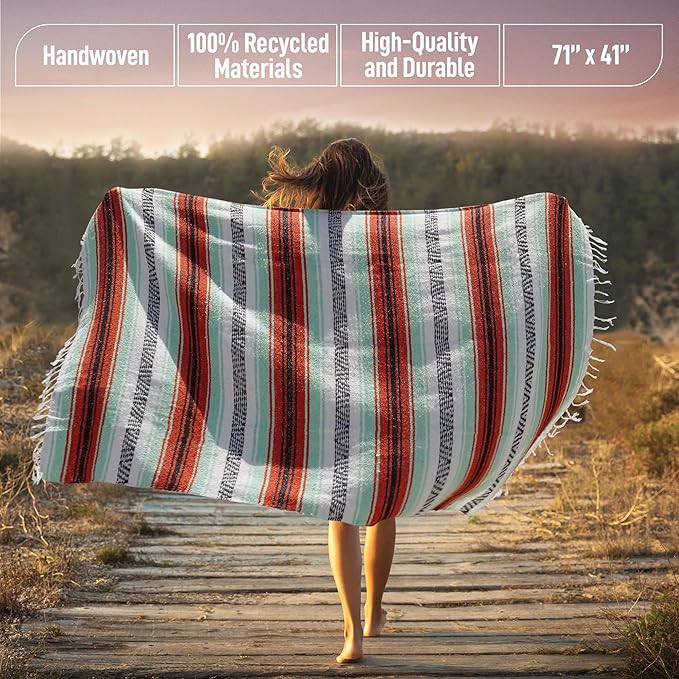 - VERSATILE HANDWOVEN BLANKETS: These serape blankets stay true to their heritage as each blanket is beautifully handcrafted with slight variations in size and weight as part of the timeless look and feel. Place it on the wall as part of your western home decor, or use it as a yoga blanket, car blanket, picnic blanket, saddle blanket, beach blanket, and much more.