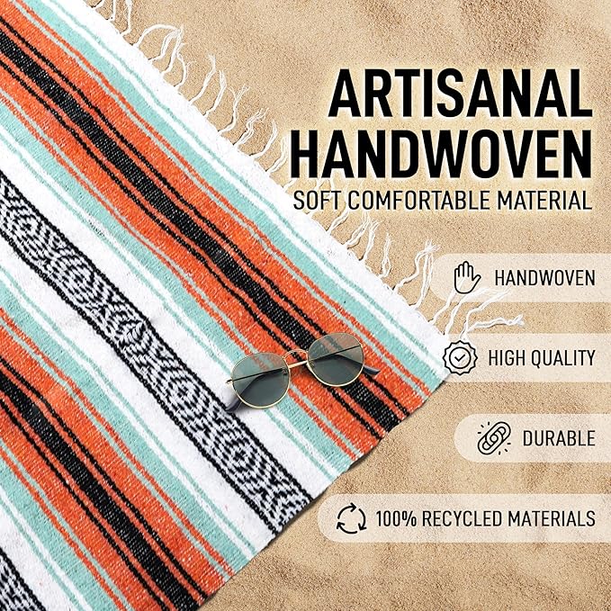 Authentic Extra Large Mexican Blanket (70"x50") - Handwoven Yoga Blanket, Serape Blanket - Artisanal Falsa Blanket, Beach Blanket, Camping Blanket, Picnic Blanket, Outdoor Blanket (Mint-Orange)