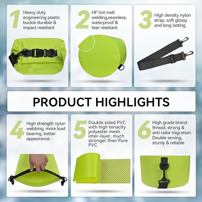 • Floatable and Trackable: The dry sack can float on water without sinking after being rolled up and buckled, so you can quickly track and retrieve your stuff. The D-ring and strap on the bag make it easy to attach to the boat, keeping your stuff always with you without getting lost, allowing you to enjoy thrilling outdoor activities with peace of mind.