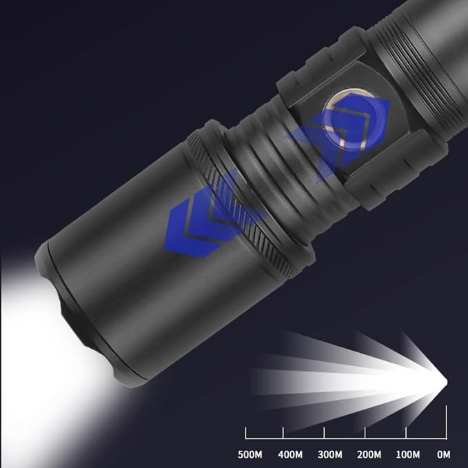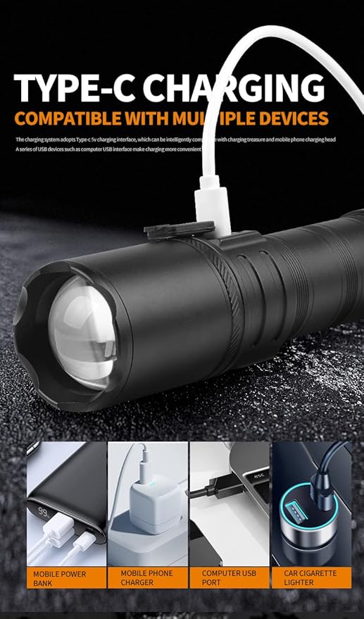- 【USB Rechargeable】Equipped with a USB input port and a USB charging cable, the flashlight can be charged anytime and anywhere through a laptop, USB plug, car charger and mobile power supply.