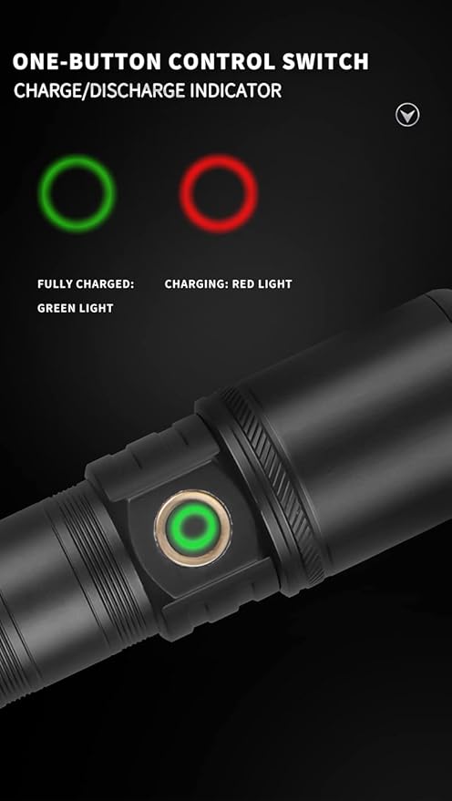 - 【Power Display】The green indicator in the switch indicates that it is fully charged,and the red indicator light indicates that the flahslight is too low and needs to be charged in time.