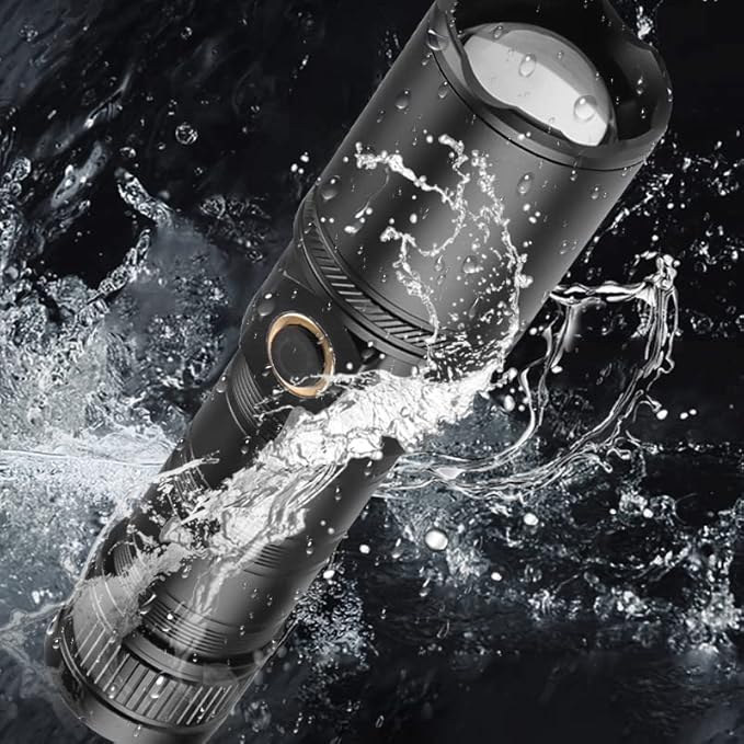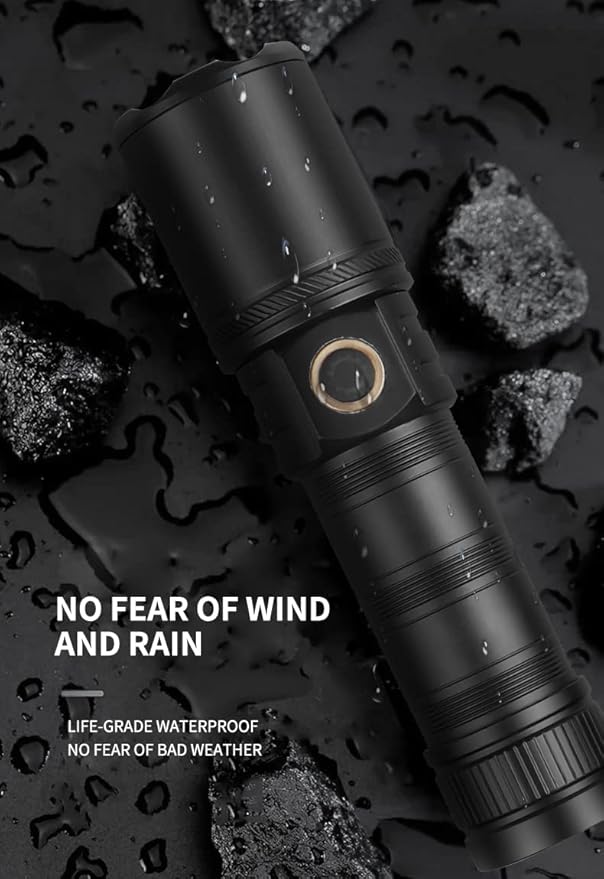 - 【Waterproof and Durable】The tactical rechargeable flashlight is made of military-grade aluminum alloy,IPX5 waterproof Level, It can be used in extreme weather such as rain, heavy snow ,Sturdy and durable enough for long time daily using.