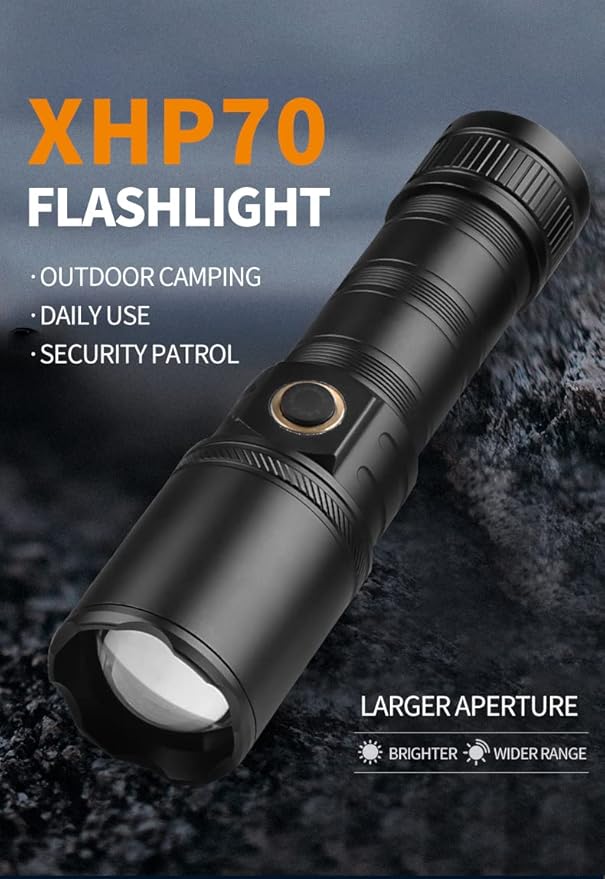 - 【3 Lighting Modes & Super Bright】 The powerful LED flashlight has 3 lighting modes: High, Low, Strobe, which can meet all kinds of your lighting needs. The latest generation XHP70 LED chip that can produce an ultra high output of up to 1200000 lumen to enlighten about 1000 meters