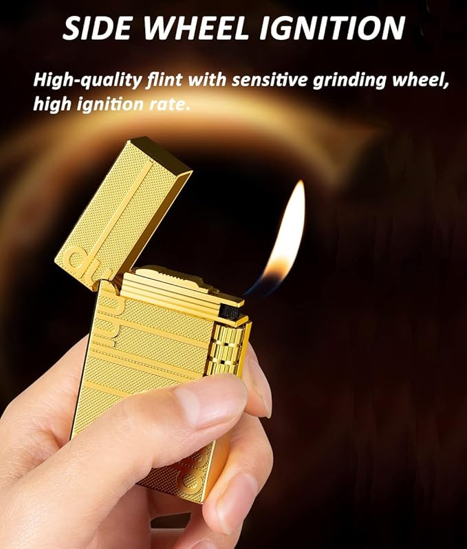 - 🔥High Quality & Flint Changeable---Adapt tungsten steel grinding wheel, more durable and high ignition rate. Unlike other cheap plastic lighters, this lighter is made of zinc alloy and adopted drawing process technique, which made it more fashionable and beautiful. The body of the lighter has clear textured, embossed technology, smooth and comfortable.Retro style flint wheel ignition design. The flint wheel can be applied as a fire starter to light up a campfire by switching off the butane.