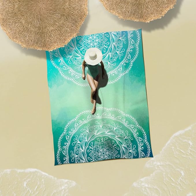 Sunlit Silky Soft 106"x81" Boho Sand Proof Beach Blanket Sand Proof Mat with Corner Pockets and Mesh Bag for Beach Party, Travel, Camping and Outdoor Music Festival, Bright Turquoise Mandala