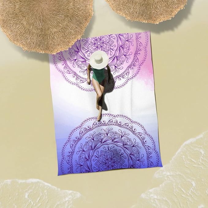 Sunlit Silky Soft 106"x81" Boho Sand Proof Beach Blanket Sand Proof Mat with Corner Pockets and Mesh Bag for Beach Party, Travel, Camping and Outdoor Music Festival, Purple Lines Pink Mandala