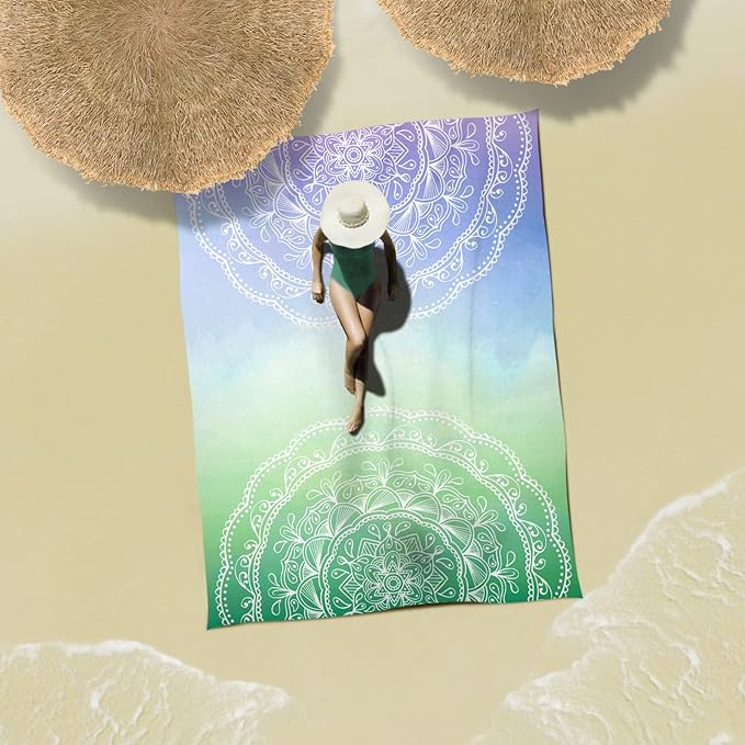 Sunlit Silky Soft 106"x81" Boho Sand Proof Beach Blanket Sand Proof Mat with Corner Pockets and Mesh Bag for Beach Party, Travel, Camping and Outdoor Music Festival, Blue Violet Sea Green Mandala