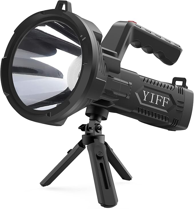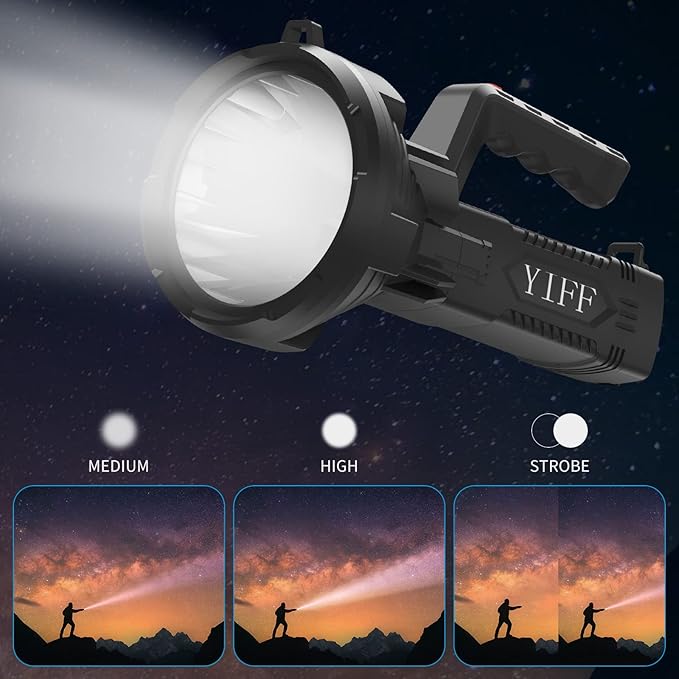 - SUPER-BRIGHT: This spotlight uses upgraded LEDs with an output of up to 12,000 lumens and provides an illumination distance of 2,000 feet. Run time at high brightness is 6 hours. Features a zoom and 3 adaptive settings. High/Medium/SOS.