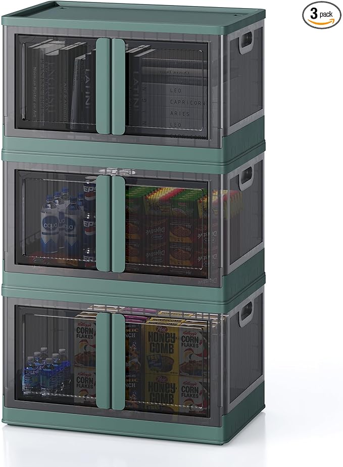 19Gal Collapsible Storage Bins with Lids & Wheels - 3 Pack Stackable with Doors, Heavy-Duty Plastic Containers for Home/Office, Green
