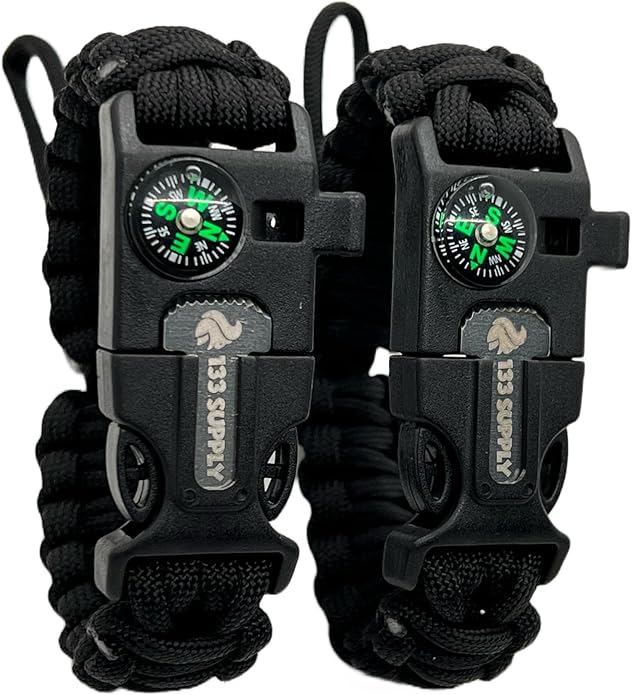 - 133 SUPPLY Paracord Bracelet Survival Bracelet Compass Hiking Survial Fire Starter Gear. Paracord Bracelets - Hiking Compass survival bracelets for men, woman, and kids are must have for your emergency supplies! These survival tools are an excellent addition to a tactical stocking gifts, camping survival kits, emergency car kits, edc gear and much more!